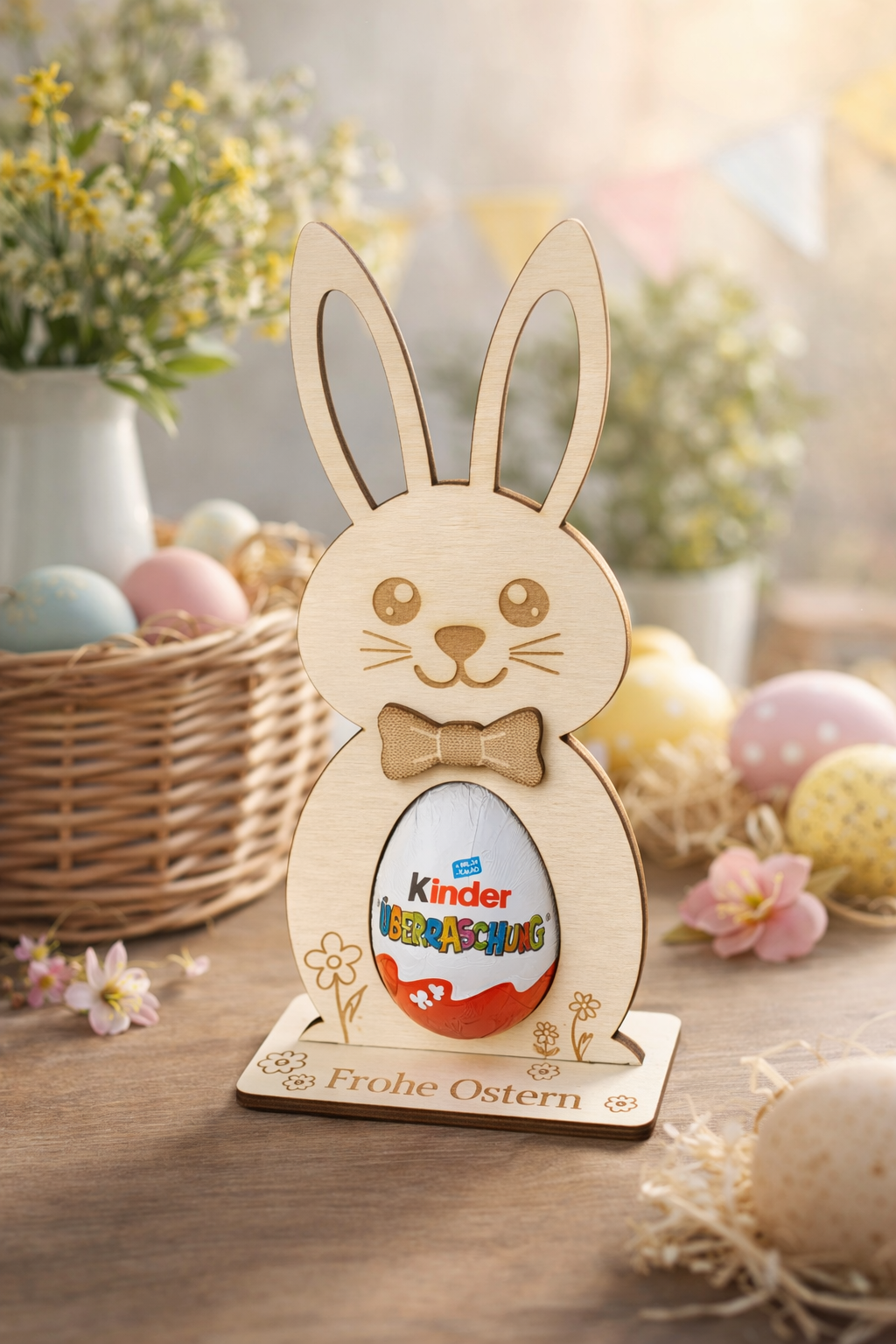 Der stabile Standfuß mit der Gravur „Frohe Ostern“ macht ihn zu einem echten Hingucker – ideal für Tisch, Fensterbank oder das Osternest.